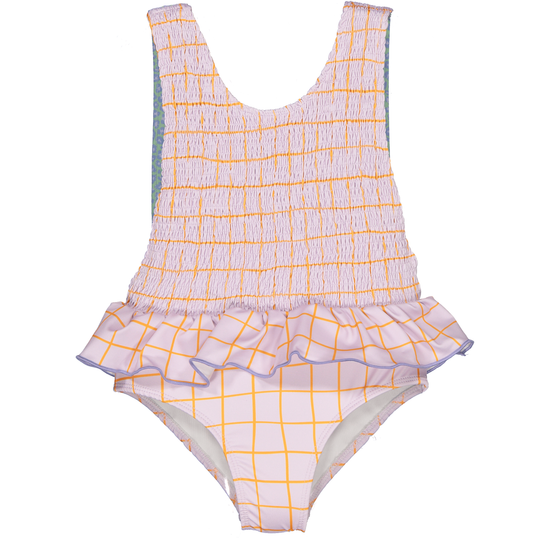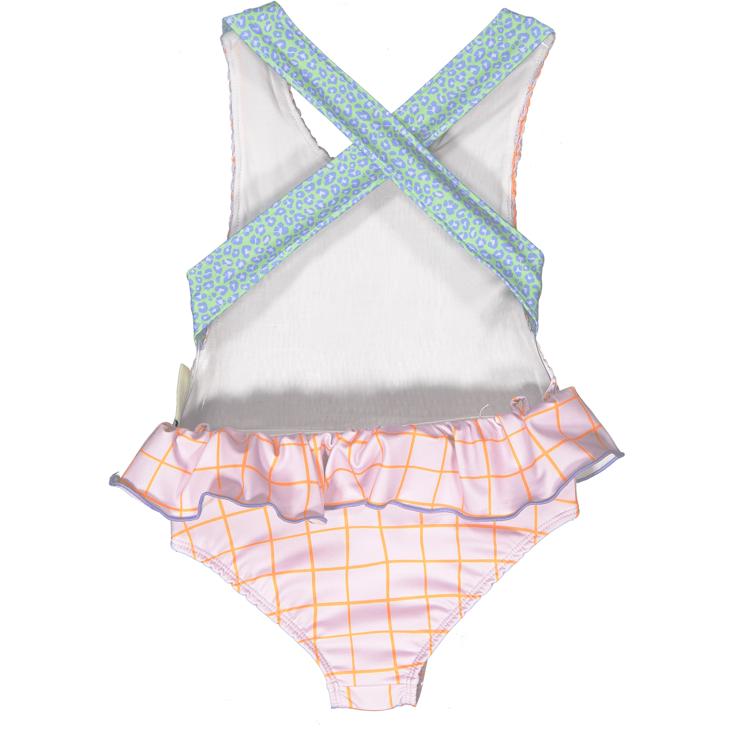 This playful lilac and orange chequered swim costume features eye-catching green leopard print adjustable straps for the perfect fit. The adorable ruffle detail around the waistband adds a touch of flair that little girls will love. Complete the look with our matching brother style for coordinated poolside fun!