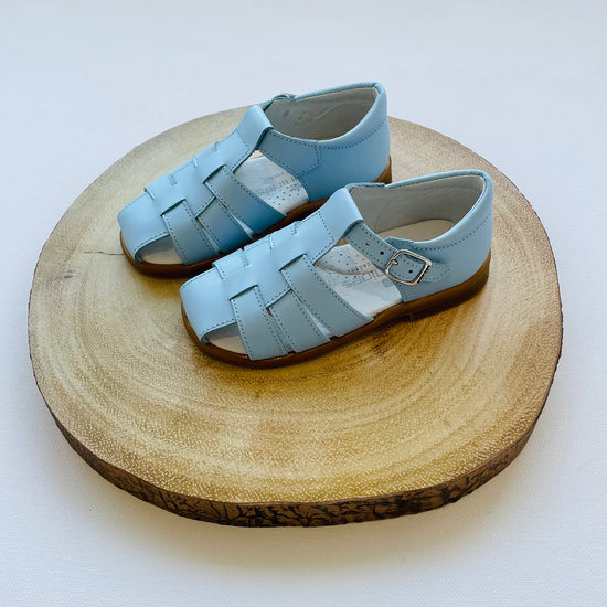 These boys sandals are crafted from soft-to-the-touch leather in a pale blue shade. Featuring a latticed front design and a silver buckle fastening for support, the sandals are designed for all-day comfort with a cushioned inner sole.